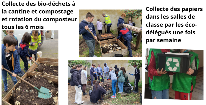 Dans le but de valoriser le papier jeté de l’établissement et les de la cantine, les élèves éco-délégués volontaires s’occupent de jeter les déchets compostables de la cantine et de vider les boîtes de tri du papier dans les salles chaque semaine.